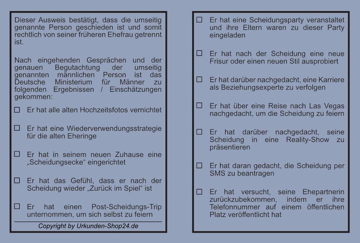 Ein lustiger Ausweis für jede geschiedene Frau. Dieser Spaßausweis ist für jede geschiedene Frau ein großartiges Geschenk. Es kann eine Möglichkeit sein, den neuen Lebensabschnitt mit Humor zu betrachten und gleichzeitig eine lustige Erinnerung an die Vergangenheit zu behalten.Der Ausweis hat eine Größe von 13,5 x 9,5 cm und ist schon fertig gefalzt, damit man ihn schön falten kann. So passt er in jeden Geldbeutel. Gedruckt wird der Ausweis auf hochwertigem farbigem Papier (160g. pro m²), also kein normales Papier, sondern richtig fester Karton.Bitte beachten Sie weiter, dass Farben von den Browsern unterschiedlich dargestellt werden, so kann es zu Farbabweichungen zwischen Original und Abbild kommen!