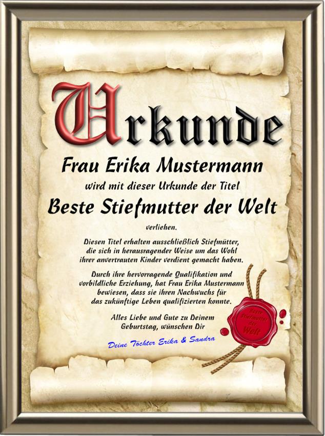 Jede Urkunde wird einzeln, mit den Daten der Stiefmutter, hergestellt und gedruckt.