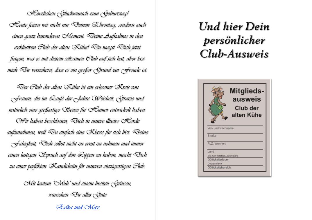 Glückwunschkarte incl. einem Ausweis vom Club der alten Kühe.