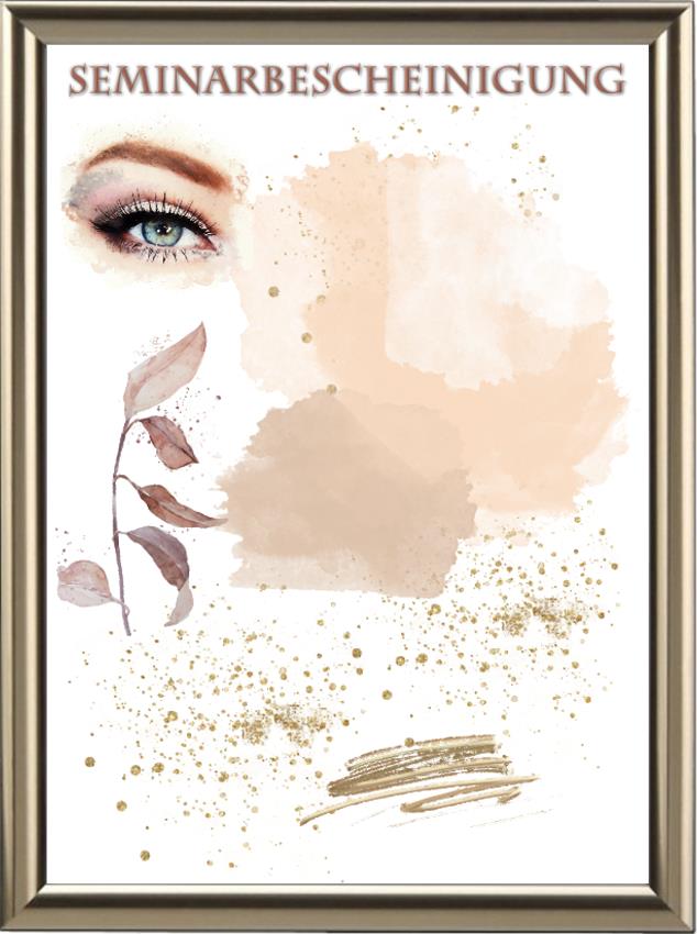 Diese wunderschöne Blankourkunde im DIN-A4-Format ist die perfekte Grundlage, um Seminare und Fortbildungen stilvoll zu bestätigen. Das Design besticht durch zarte Aquarelltöne in Beige, Rosé und Braun, ergänzt durch funkelnde Goldakzente, die dem Dokument eine edle und ansprechende Ästhetik verleihen. Ein ausdrucksstarkes Auge und filigrane Blattmotive in warmen Herbstfarben runden den modernen und doch zeitlosen Look ab.