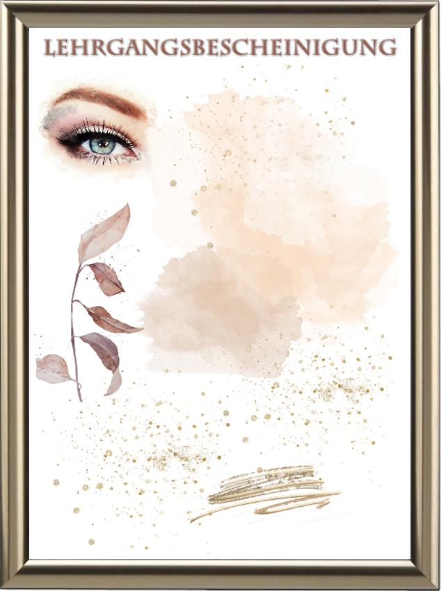 Diese wunderschöne Blankourkunde im DIN-A4-Format ist die perfekte Grundlage, um Lehrgänge und Ausbildungen stilvoll zu bestätigen. Das Design besticht durch zarte Aquarelltöne in Beige, Rosé und Braun, ergänzt durch funkelnde Goldakzente, die dem Dokument eine edle und ansprechende Ästhetik verleihen. Ein ausdrucksstarkes Auge und filigrane Blattmotive in warmen Herbstfarben runden den modernen und doch zeitlosen Look ab.