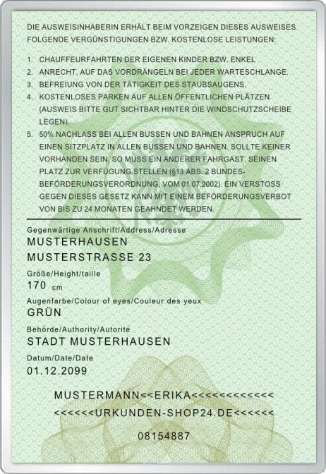 Der Ausweis ist ausschließlich für den privaten Gebrauch vorgesehen und als "Scherzartikel" zu verstehen. Der Ausweis darf nicht im öffentlichen Verkehr genutzt werden. Er hat keinen offiziellen Status und ist auch kein offizielles Dokument oder Urkunde. Er darf nicht im Rechtsverkehr genutzt werden!