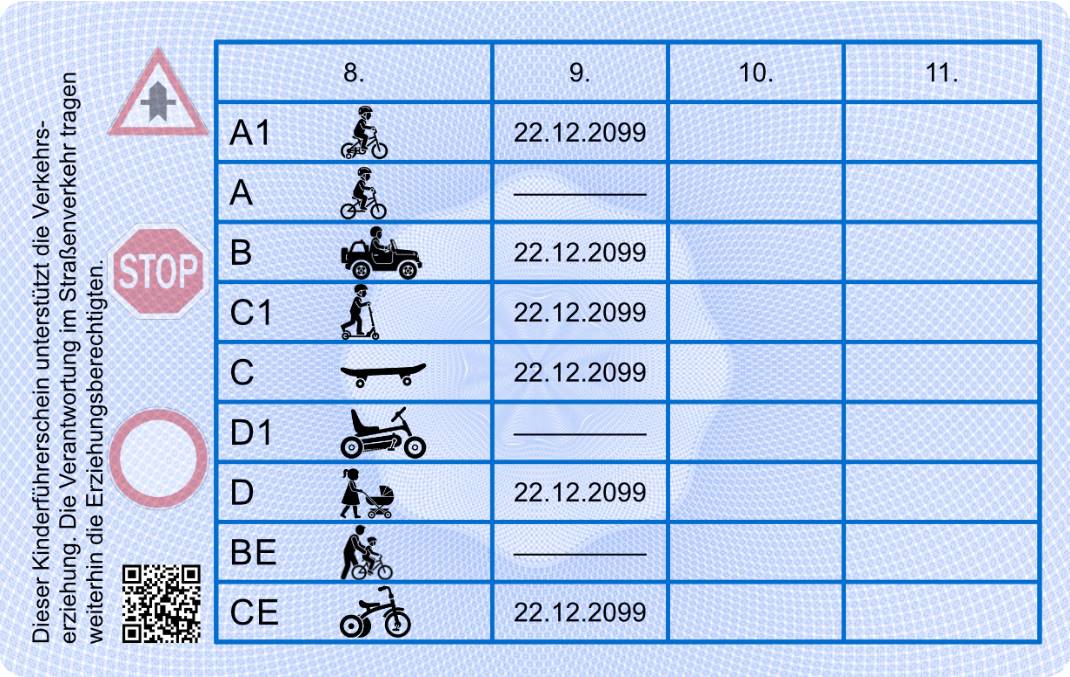 Die Vorderseite zeigt das individuelle Foto und die persönlichen Daten des Kindes, während die Rückseite in klarem Blau eine Tabelle mit verschiedenen Fahrzeugkategorien (vom Fahrrad über das Laufrad bis zum Tretroller) und den jeweiligen Gültigkeitsdaten (wählbar zwischen 1, 2 oder 3 Jahren) enthält, um das Gefühl eines echten Führerscheins zu vermitteln. Ein QR-Code und Verkehrszeichen runden das Design ab. Jede Karte wird einzeln nach Kundenwunsch gedruckt.