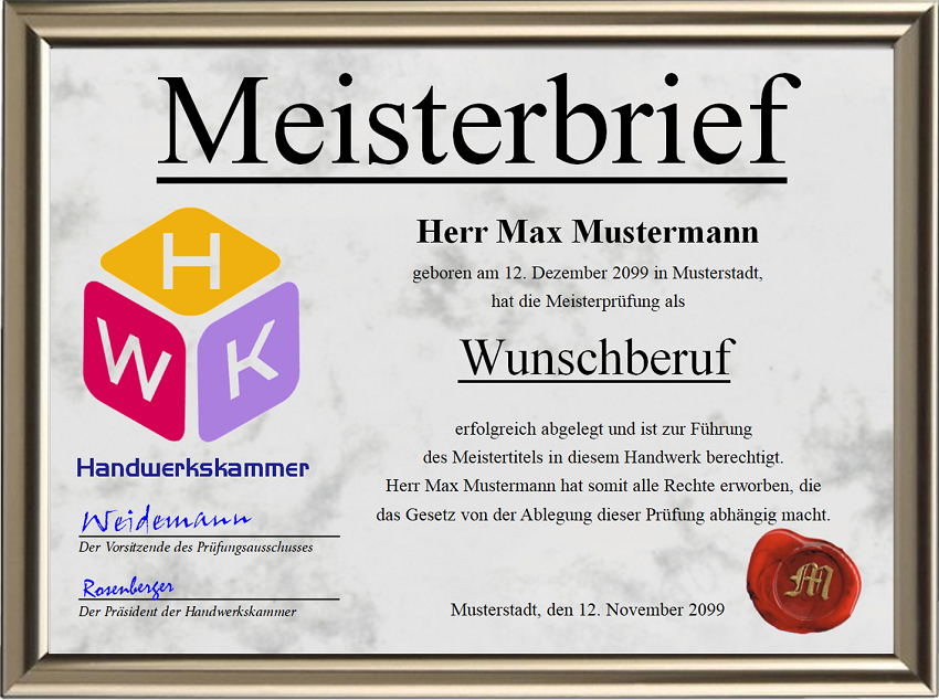 Nach Ihren Angaben erstellen wir einen einmaligen Meisterbrief für Sie.