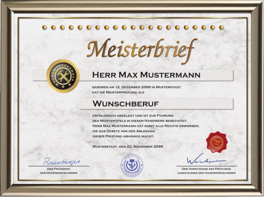 Nach Ihren Angaben erstellen wir einen einmaligen Meisterbrief für Sie.