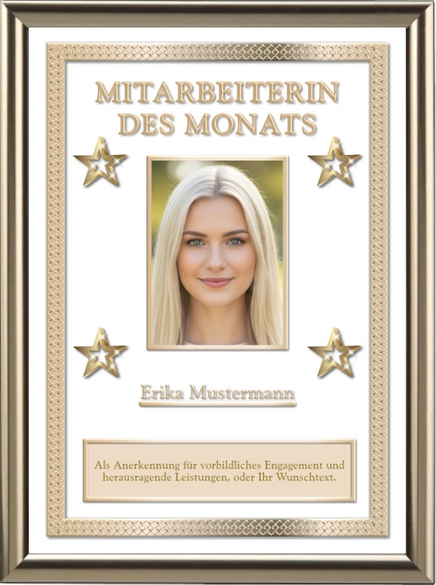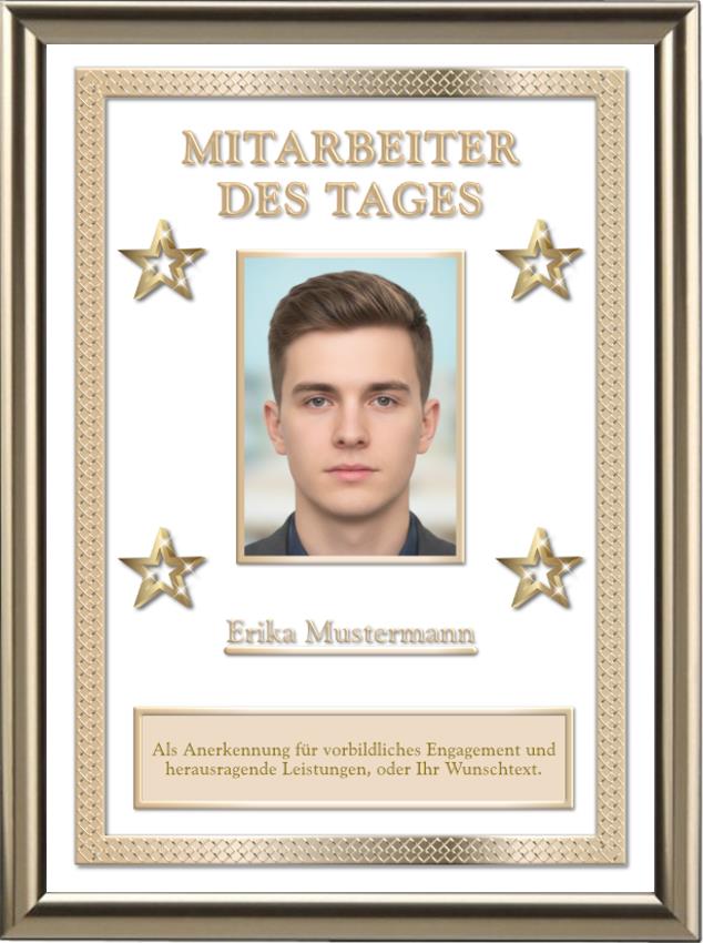 Ob als Mitarbeiter des Jahres, der Woche, des Monats oder des Tages – dieses personalisierte Zertifikat würdigt das vorbildliche Engagement Ihrer Kollegen im Berufsleben. Der luxuriöse Look wird durch die strahlenden Stern-Applikationen unterstrichen. Die Urkunde wird auf hochwertigem 160 g/m² DIN-A4 Papier gedruckt, das sich spürbar stabiler und kartonartiger als herkömmliches Papier anfühlt.