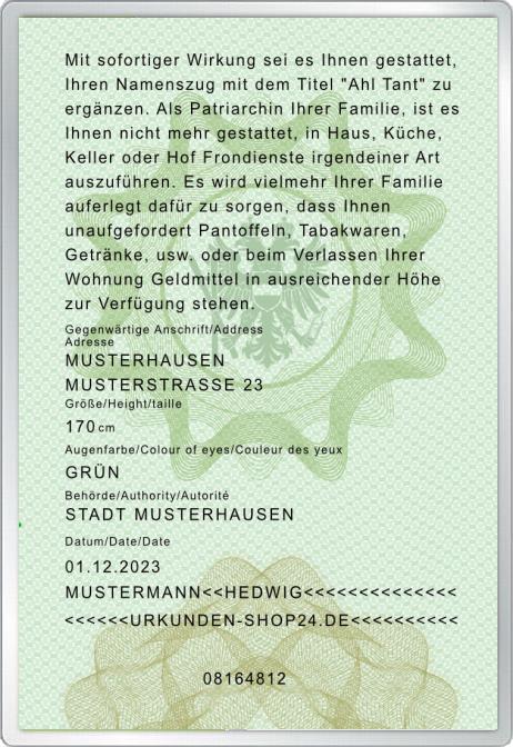Unser personalisierbarer "Ahl Tant" Ausweis im traditionellen Design des alten deutschen Personalausweises (110 x 80 mm) ist ein witziger Hingucker!