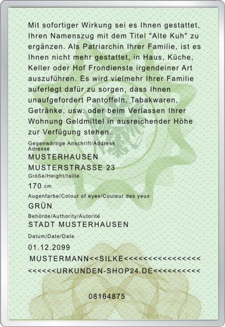 Geburtstag und noch kein Geschenk?Da haben wir was für Sie!Die Aufnahmeurkunde in den Verein alter Kühe. Sehr geehrte Frau Erika Mustermann Wir freuen uns, Ihnen zur Vollendung Ihres 30. Lebensjahres gratulieren zu können. Lange haben Sie auf diesen Tag gewartet. Nachdem wir über einen längeren Zeitraum Ihre Lebensgewohnheiten, Ihr Verhalten gegenüber Ihren Mitmenschen, vor allem aber Ihren Umgang mit den "Alten Kühen" beobachtet und für ausreichend gehalten haben, hat Sie der Vorstand für würdig empfunden, Ihrem ständigen Drängen auf Aufnahme in unseren ehrenvollen Verein nachzugeben. Eine "Alte Kuh" zu sein heißt aber nicht, die Hände in den Schoß zu legen. Jetzt erst, nachdem Ihnen die vollwertige Mitgliedschaft eines bewundernswerten Vereins bescheinigt wird, werden Sie Gelegenheit dazu haben, sich im Kreise "Alter Kühe" zu bewähren. Durch die Aufnahme in unseren Verein werden Sie berechtigt, anstelle des Bundesverdienstkreuzes an Ihrer Bluse eine kleine Kuh als Orden zu tragen. Für festliche Anlässe sind Armbinden und Strumpfbänder in entsprechender Form vorgesehen. Diese Attribute Ihrer Würde in pfleglicher Qualität hält der einschlägige Fachhandel für Sie bereit. So mögen Sie erkennen, dass wir eine Persönlichkeit, wie Sie es nun einmal sind, gebührend zu ehren wissen. Feiern Sie den heutigen Tag nicht so sehr wegen Erreichung Ihres 30. Lebensjahres, sondern vielmehr als Ehrentag wegen der Aufnahme in den Verein "Alter Kühe". Noch eines. Mit sofortiger Wirkung sei es Ihnen gestattet, Ihren Namenszug mit dem Titel "Alte Kuh" zu ergänzen. Als Patriarchin Ihrer Familie, in Ihrer Eigenschaft als Vereinsmitglied, ist es Ihnen nicht mehr gestattet, in Haus, Küche, Keller oder Hof Frondienste irgendeiner Art auszuführen. Es wird vielmehr Ihrer Familie auferlegt, beim Tragen des Ehrenzeichens dafür zu sorgen, dass Ihnen unaufgefordert Pantoffeln, Tabakwaren, Getränke, usw. oder beim Verlassen Ihrer Wohnung Geldmittel in ausreichender Höhe zur Verfügung stehen. Legen Sie stets ein fast gutes Verhalten an den Tag, damit wir Ihnen einst bedenkenlos den Titel "Uralt Kuh" verleihen können.In Freude und Ergriffenheit begrüßt Sie der Vereinsvorsitzender mit "Kuh Heil"! Ich verbleibe,mit freundlichen Grüßen Regina Alte Kuh ElsaVorsitzendeVerein alter Kühe e.V. Jede Aufnahmeurkunde wird einzeln, nach den Daten des Geburtstagskindes, hergestellt und gedruckt.Also keine 08/15 Urkunde, sondern ein einmaliges Unikat! Und das beste, Sie können den Inhalt der Urkunde selbst mitbestimmen. Gedruckt wird die Urkunde auf hochwertigen Urkundenpapier (DIN A4, 185g. pro m²), also kein normales Papier, sondern richtig fester Karton.Der Versand erfolgt in einem stabilen Papprückwand-Umschlag, so das die Urkunde gut geschützt ist. Die Urkunde wird ohne Rahmen geliefert! Den passenden Rahmen finden Sie unter der Rubrik "Zubehör".