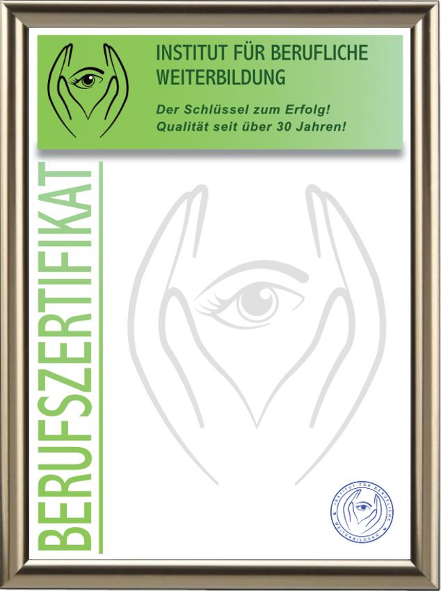 Das ansprechende Design, geprägt von den dominierenden Farben Grün und Weiß, strahlt Seriosität und Eleganz aus. Im oberen Bereich ist das Logo des "Instituts für berufliche Weiterbildung" mit dem markanten Auge-und-Hände-Motiv stilvoll integriert.